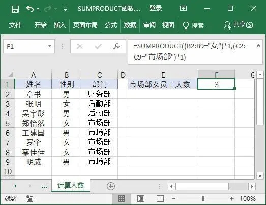 在工作表中选择要存放结果的单元格F2,输入函数“=SUMPRODUCT((B2:B9="女")_1,(C2:C9="市场部")_1)”,按下【Enter】键,即可计算出市场部的女员工人数,如下图所示。